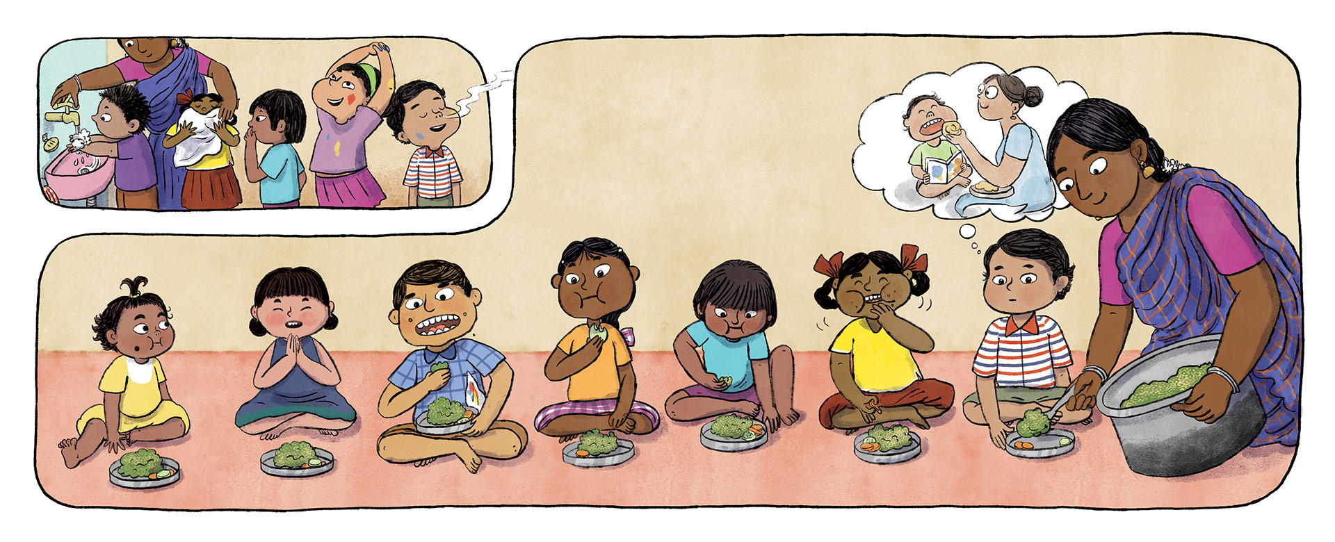 A wordless picture book, about a young boy's first day at school. Illustrated by Sunaina Coelho. Edited by Yamini Vijayan. Commissioned by Pratham Books, 2020. Available to read or download on storyweaver.org.in