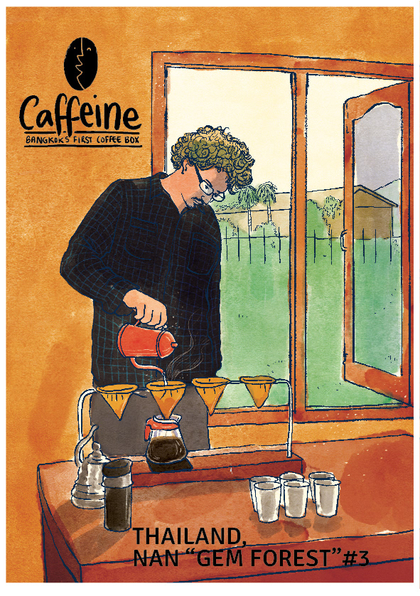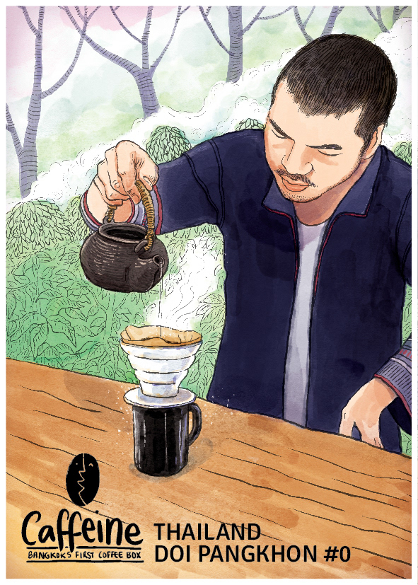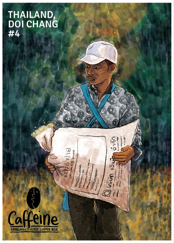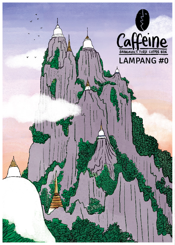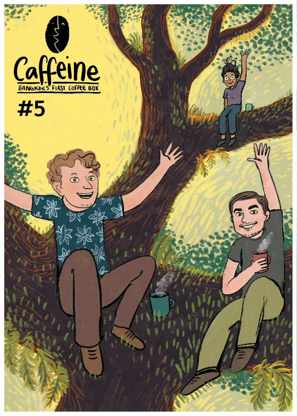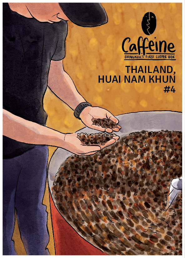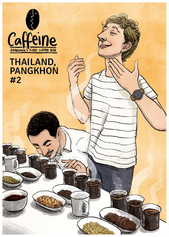 A series of postcards for Caffeine: Bangkok's first coffee box. A monthly coffee subscription sending specialty Thai coffee to aficionados. Logo design, illustrations: Sunaina Coelho